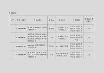 广西消化道肿瘤加速康复外科基础研究重点实验室2022年度开放课题评审工作已经结束,经过专家评审,拟对其中的4项予以立项资助,现予以公示,公示期为1周。