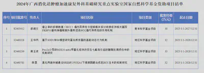 实验室2024年获得国家自然科学基金资助项目情况 余竹, 李萌萌, 林秋宁 Aug 27, 2024 1 min read 喜讯!2024年,广西消化道肿瘤加速康复外科基础研究重点实验室固定成员共获得国家自然科学基金资助项目4项,其中青年科学基金1项,地区科学基金3项,累积获得资助127万元。